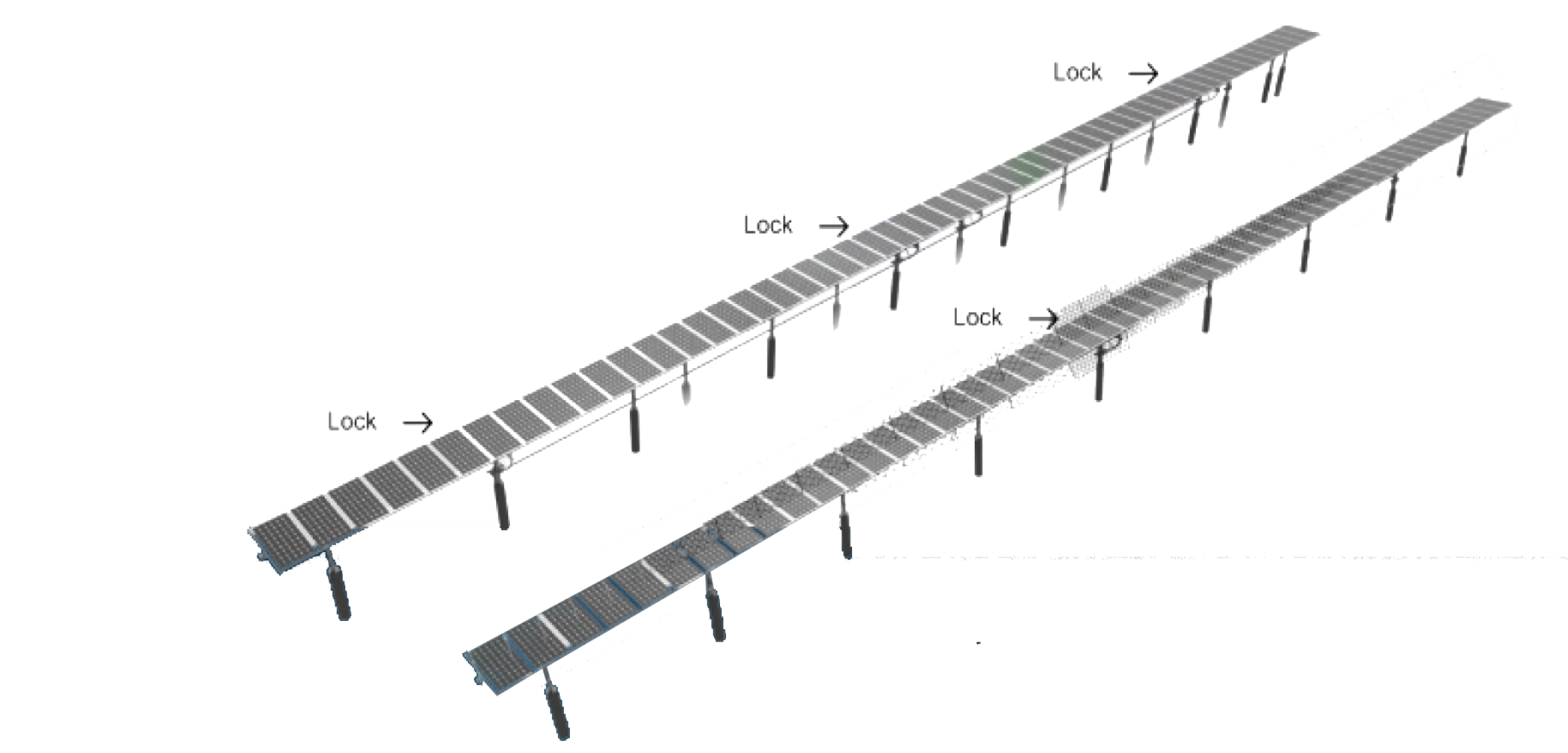 Our trackers excel in torsion control by locking the row (ROW) at three points instead of one. This innovative design significantly reduces the torsionally unsupported spans by nearly two-thirds, resulting in a lighter and more uniform section across the ROW. In contrast, other trackers lock the ROW centrally, causing torsion to concentrate at a single point and necessitating thicker torque tubes.